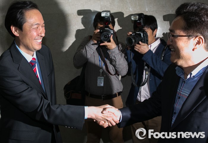 (서울=포커스뉴스) 원내대표 경선에 출마하는 우상호(왼쪽), 우원식 더불어민주당 의원이 29일 오후 서울 여의도 국회 정론관 앞에서 만나 악수하고 있다.