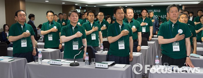 (양평=포커스뉴스) 안철수(왼쪽 네번째) 국민의당 상임공동대표, 천정배(오른쪽 세번째) 공동대표와 20대 총선 당선인들이 26일 오후 경기도 양평 한화리조트에서 열린 워크숍에 참석해 국민의례를 하고 있다.