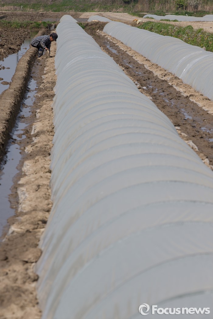 (파주=포커스뉴스) 25일 오전 경기도 파주시 오두산 인근 논밭에서 한 농부가 비닐하우스에 있는 벼들을 위해 공기를 환기시키고 있다.