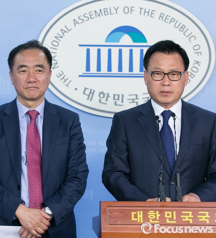 (서울=포커스뉴스) 정장선(왼쪽) 더불어민주당 총무본부장과 박광온 대변인이 27일 오전 서울 여의도 국회 정론관에서 전당대회 일정 등과 관련 브리핑을 하고 있다.