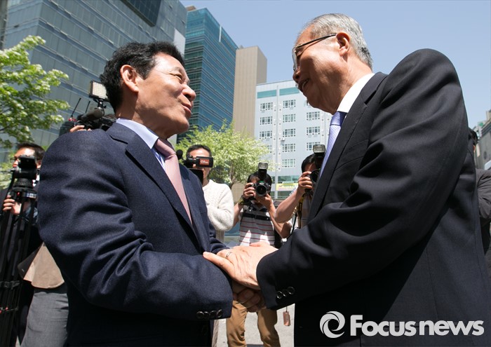 (광주=포커스뉴스) 김종인(오른쪽) 더불어민주당 비대위 대표와 윤장현 광주시장이 25일 오후 광주의 한 음식점에서 당지도부·출마자·단체장 오찬 간담회에 앞서 인사하고 있다.