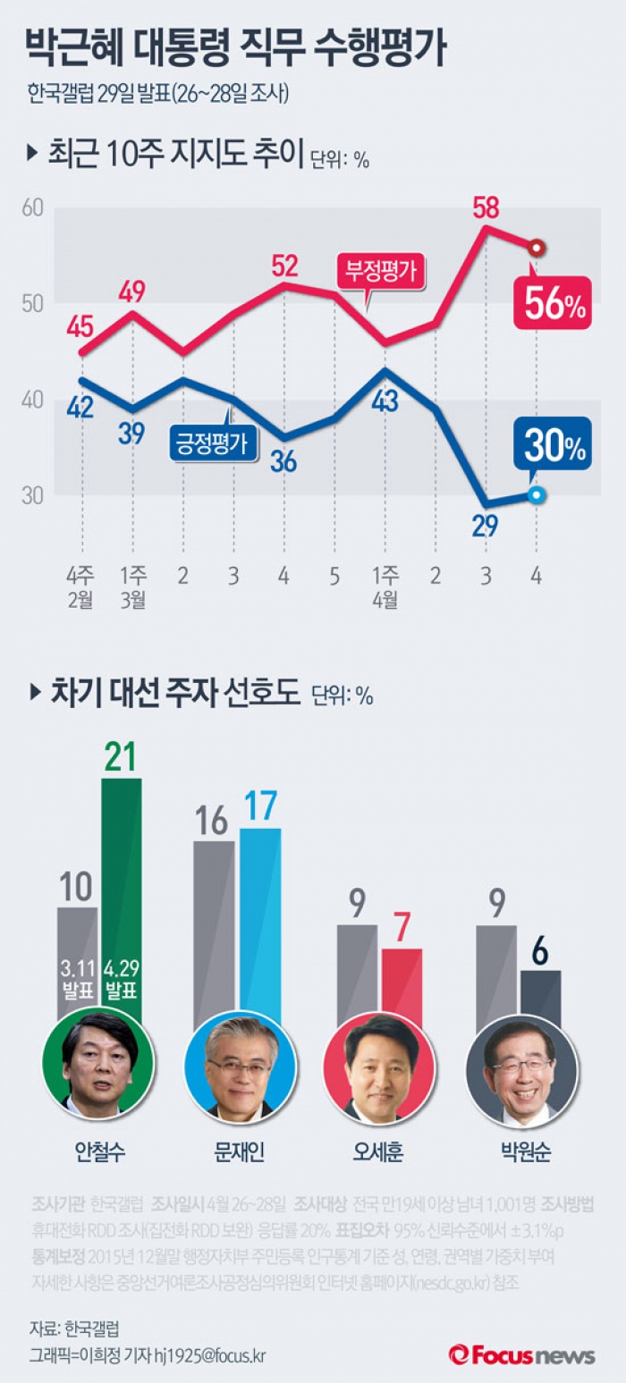 (서울=포커스뉴스) 한국갤럽이 29일 발표한 여론조사 결과에 따르면 박근혜 대통령의 직무 수행에 대해 '잘하고 있다'고 답한 비율은 30%, '잘못하고 있다'는 56%로 나타났다. 차기 대선 주자 선호도는 안철수 21%, 문재인 17%, 오세훈 7%, 박원순 6% 순으로 나타났다.