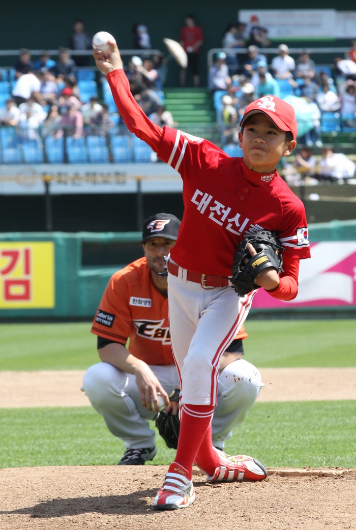 (서울=포커스뉴스)1일 키즈데이를 맞아 이동근 키즈회원이 한화생명 Eagles Park에서 시구를 하고있다. <사진제공=한화 이글스>