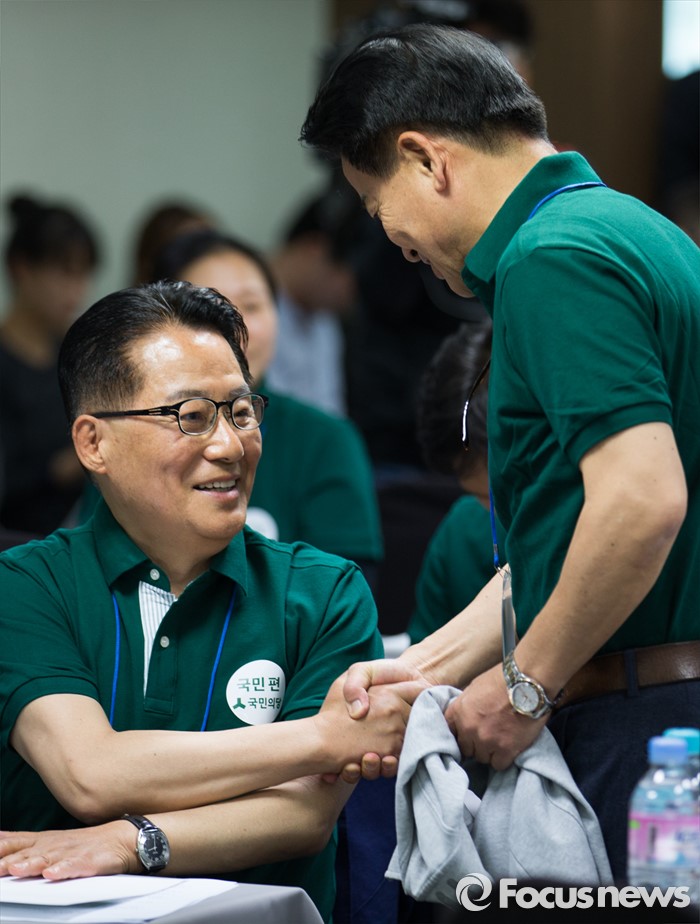 (양평=포커스뉴스) 박지원(왼쪽) 국민의당 의원과 정동영 당선인이 26일 오후 경기도 양평 한화리조트에서 열린 20대 총선 당선인 워크숍에 참석해 악수하고 있다.