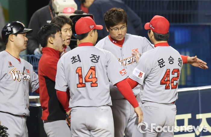 (서울=포커스뉴스) 28일 서울 잠실구장에서 열린 2016 프로야구 SK-두산 경기에서 5회까지 무실점으로 두산 타선을 잘 봉쇄한 SK 투수 문승원을 덕아웃의 동료들이 환영하고 있다.