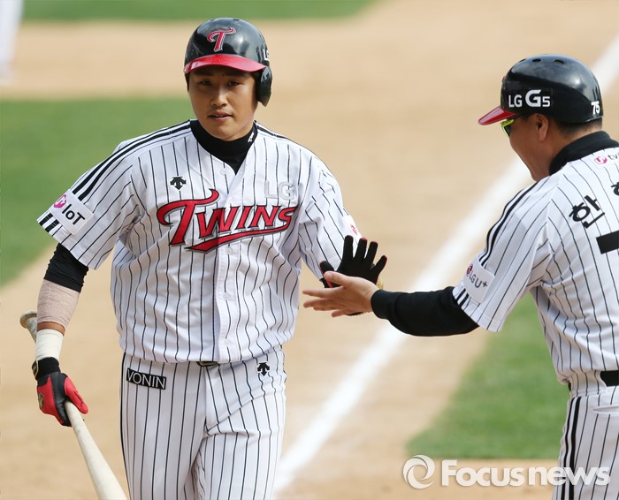 (서울=포커스뉴스) 1일 서울 잠실구장에서 열린 2016 프로야구 kt-LG 경기 5회말 LG 선두타자 채은성이 좌월 1점 홈런을 치고 한혁수 코치의 환영을 받으며 홈인하고 있다.