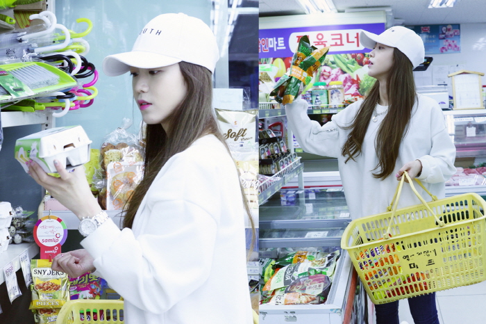 사진 속 김소희는 화이트 모자와 맨투맨을 입고 편안한 복장으로 요리에 필요한 재료를 하나하나 세심하게 구입하고 있는 모습이 담겨있다.