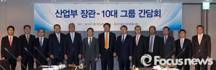 (서울=포커스뉴스) 26일 오전 서울 중구 더플라자에서 열린 '산업부 장관-10대 그룹 간담회'에서 임상혁(왼쪽부터) 전국경제인연합회 전무, 김정환 현대중공업 사장, 손영기 GS 사장, 황각규 롯데 사장, 김준 SK 사장, 김종중 삼성 사장, 주형환 산업통상자원부 장관, 정진행 현대자동차 사장. 이상봉 LG 사장, 황은연 포스코 사장, 김창범 한화 사장, 서용원 한진 사장, 배상근 한국경제연구원 부원장이 기념촬영을 하고 있다.