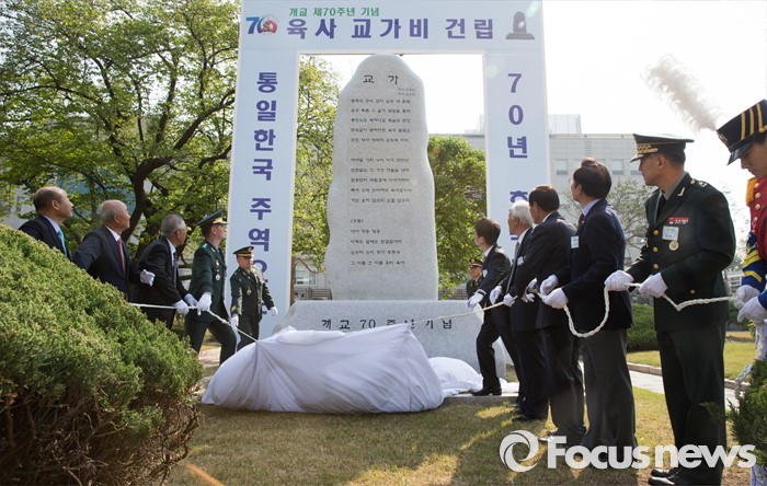 (서울=포커스뉴스) 29일 오후 서울 노원구 육군사관학교에서 최병로 육군사관학교장을 비롯한 내빈들이 개교 70주년 기념 교가비 제막을 하고 있다.