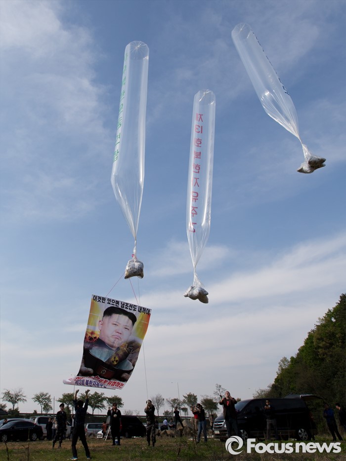 (파주=포커스뉴스) 29일 오후 경기 파주 낙하IC 인근에서 탈북자단체인 자유북한운동연합이 북한에 핵과 미사일을 포기하고 국제사회 일원으로 참여할 것을 촉구하는 내용의 대북전단을 날려보내고 있다.