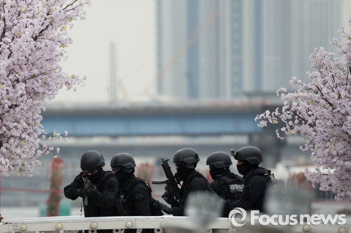 (서울=포커스뉴스) 27일 오전 서울 영등포구 여의도 한강공원 원효대교 일대에서 열린 '수도 서울 민․관․군 합동 대규모 복합재난 가상훈련'에 참가한 경찰특공대가 훈련에 임하고 있다.