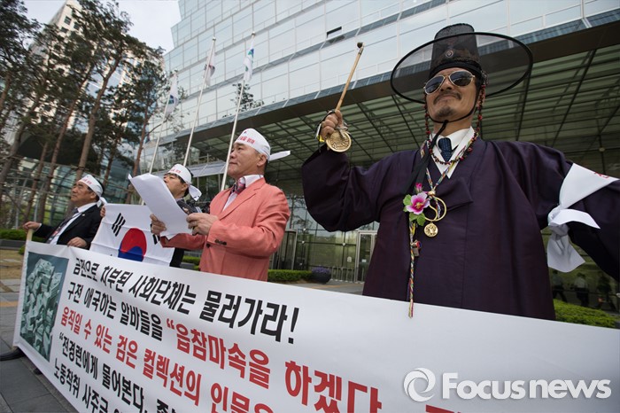(서울=포커스뉴스) 26일 오후 서울 영등포구 전경련회관 앞에서 애국국민운동대연합 회원들이 어버이연합 억대 금품지원 규탄 기자회견을 하고 있다.