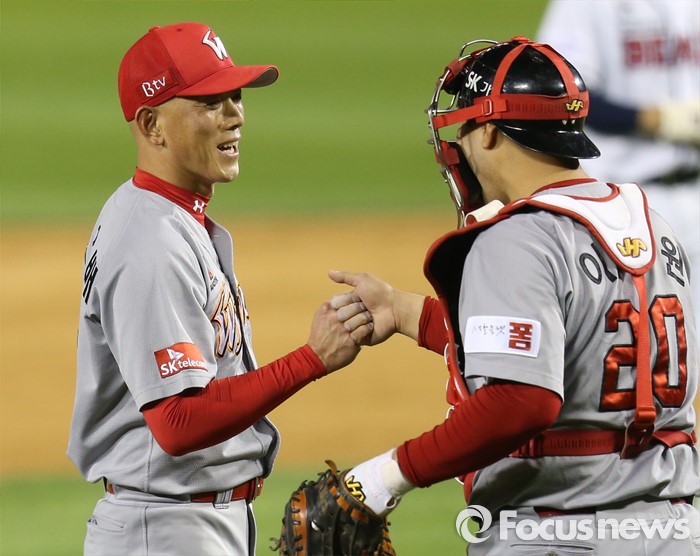 (서울=포커스뉴스) 27일 서울 잠실구장에서 열린 2016 프로야구 SK-두산 경기에서 3-1로 승리한 SK 투수 박정배와 포수 이재원이 주먹을 마주치고 있다.