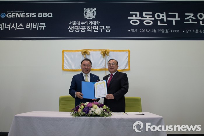 (서울=포커스뉴스) 25일 오전 서울 관악구 서울대학교 수의과대학 생명공학 연구동에서 열린 서울대-BBQ 공동연구 조인식에 윤홍근(왼쪽) 제너시스비비큐 그룹 회장과 박용호 서울대 수의과대학 교수가 협약서를 들고 기념촬영하고 있다.