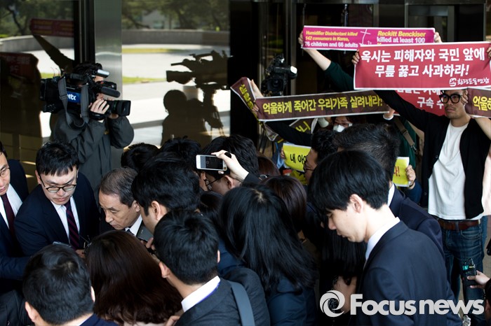 | △ 취재진 질문 받는 신현우 전 옥시 대표 |