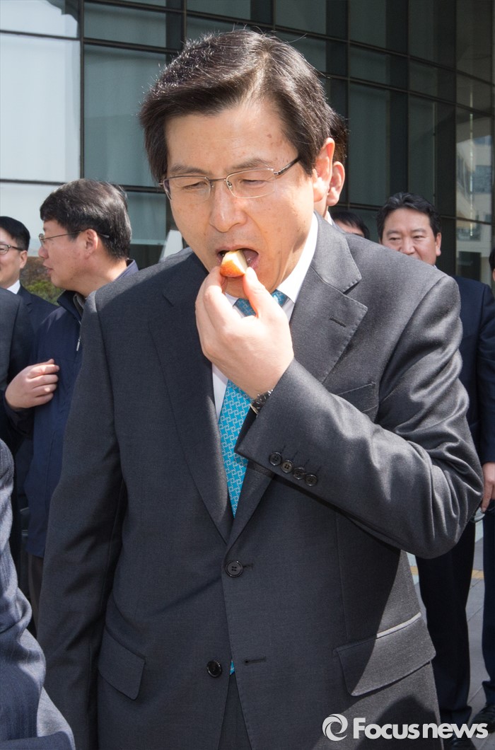 (세종=포커스뉴스) 황교안 국무총리가 26일 오전 세종시 정부세종청사 국토교통부 내 광장에서 열린 국무총리실과 1사 1촌 자매결연을 맺은 충주 재오개마을 농·특산물 직거래 장터에 방문해 사과를 맛보고 있다.