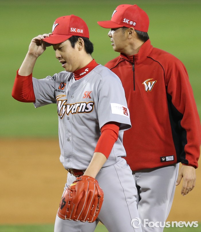 (서울=포커스뉴스) 28일 서울 잠실구장에서 열린 2016 프로야구 SK-두산 경기 6회말 1사 2,3루에서 SK 투수 문승원이 두산 양의지에게 동점타를 맞은후 마운드를 내려 가고 있다.