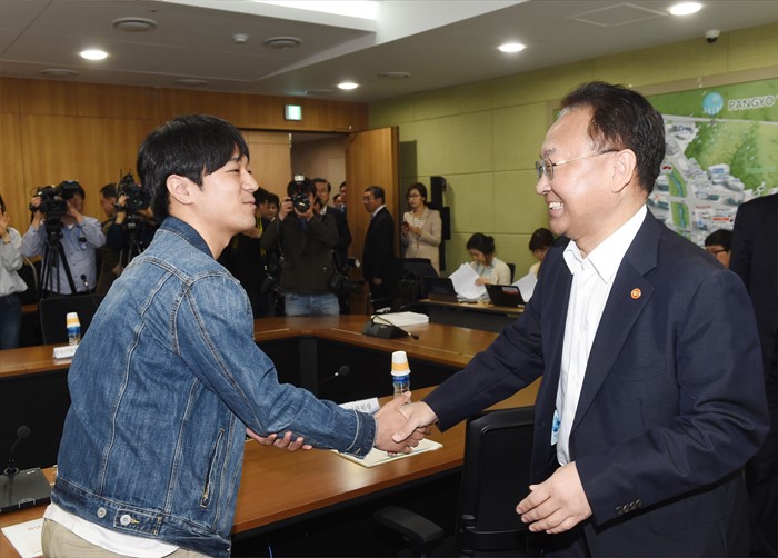 | △ 취준생과 악수하는 유일호 부총리 |