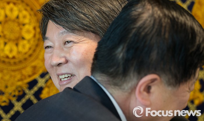 (서울=포커스뉴스) 안철수 국민의당 상임공동대표가 25일 오후 서울 영등포구의 한 중식당에서 제20대 국회의원 선거 서울지역 출마자들과 오찬간담회에 앞서 포옹을 하고 있다.