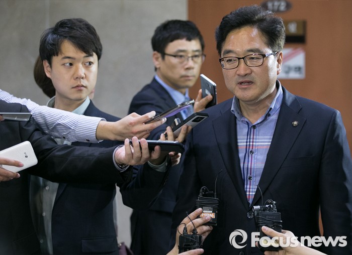 (서울=포커스뉴스) 우원식 더불어민주당 의원이 29일 오후 서울 여의도 국회 정론관에서 원내대표 출마 기자회견을 마친 뒤 취재진 질문에 답하고 있다.