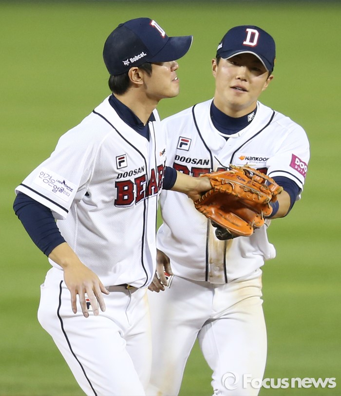 (서울=포커스뉴스) 26일 서울 잠실구장에서 열린 2016 프로야구 SK-두산 경기 8회초 1사 1루에서 병살플레이를 성공하면서 수비를 마친 두산 유격수 김재호(왼쪽)와 2루수 류지혁이 글로브를 마주치면서 덕아웃으로 향하고 있다.