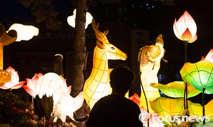 (서울=포커스뉴스) 부처님오신날을 앞두고 26일 밤 서울 종로구 견지동 조계사 정문 앞에 다양한 형태의 연등들이 불을 밝히고 있는 가운데 길을 지나던 시민들이 연등을 구경하고 있다.