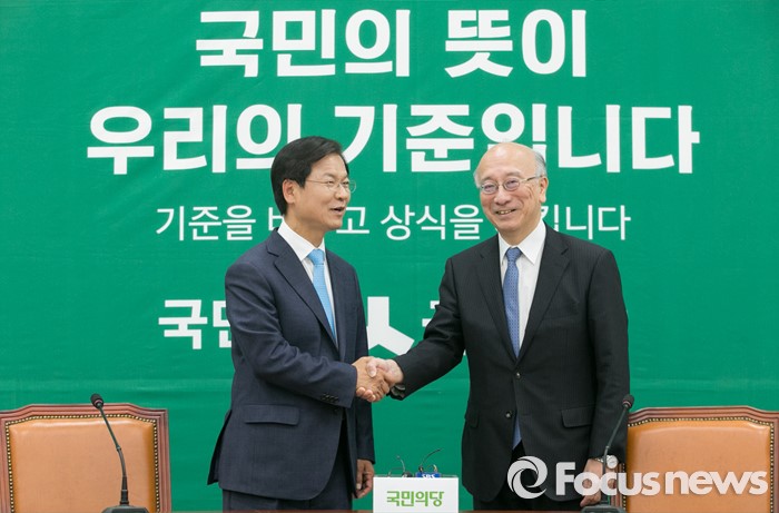 (서울=포커스뉴스) 천정배(왼쪽) 국민의당 공동대표가 29일 오후 서울 여의도 국회를 방문한 벳쇼 코로 주한일본대사와 악수를 하며 취재진을 향해 포즈를 취하고 있다.