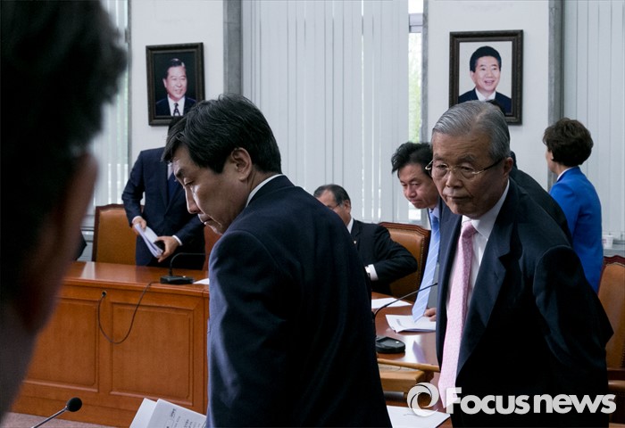 (서울=포커스뉴스) 김종인(오른쪽) 더불어민주당 비대위 대표와 이종걸 원내대표 등 비대위원들이 27일 오전 서울 여의도 국회에서 비상대책위원회의를 마친 뒤 퇴장하고 있다.