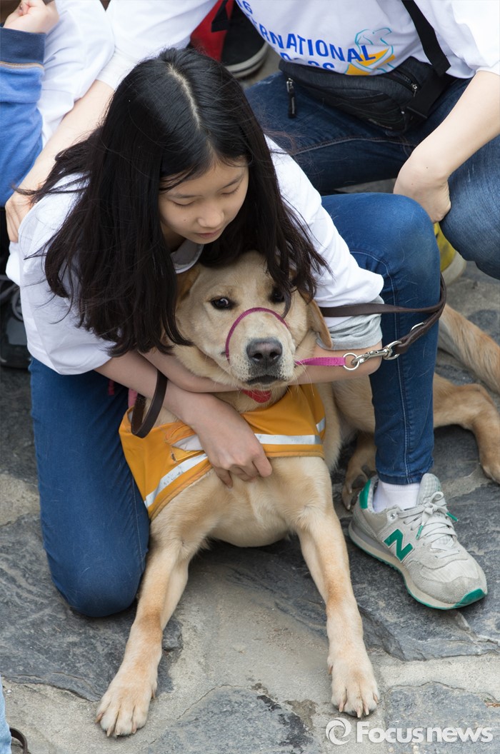(서울=포커스뉴스) 27일 오전 서울 청계천에서 삼성화재안내견학교 훈련사들과 안내견들이 시민들과 함께 '안내견과의 만남' 행사를 하고 있다.