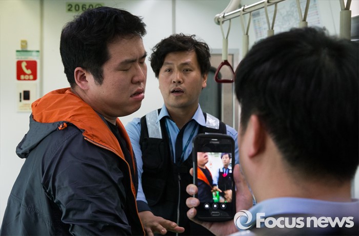 (서울=포커스뉴스) 28일 오후 서울 성동구 신설동행 열차 내에서 서울메트로 소속 지하철보안관들이 술에 취한 난동자를 제압하는 훈련을 하고 있다.