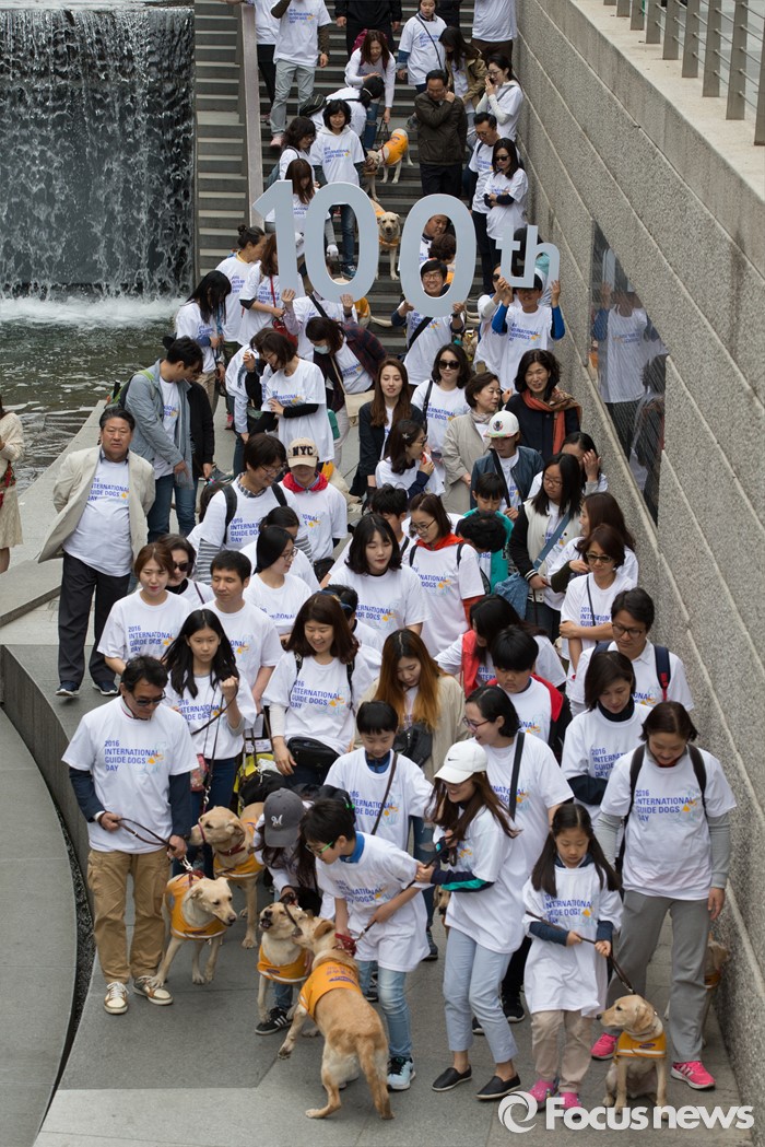 (서울=포커스뉴스) 27일 오전 서울 청계천에서 삼성화재안내견학교 훈련사들과 안내견들이 시민들과 함께 '안내견과의 만남' 행사를 하고 있다.