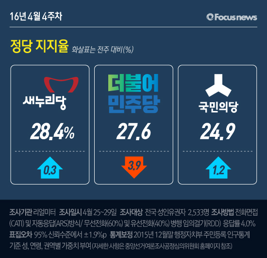 리얼미터가 2일 발표한 4월 4주차 여론조사 결과에 따르면 새누리당이 28.4% 지지도를 기록하며 1위를 탈환했다.