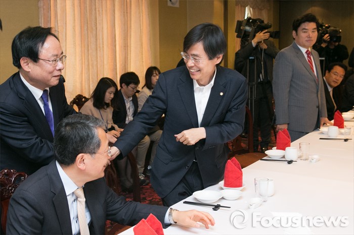 (서울=포커스뉴스) 이주영(왼쪽) 새누리당 의원과 조경태 의원이 25일 오후 서울 여의도의 한 중식당에서 열린 중진의원 오찬 간담회에 참석해 악수하고 있다.