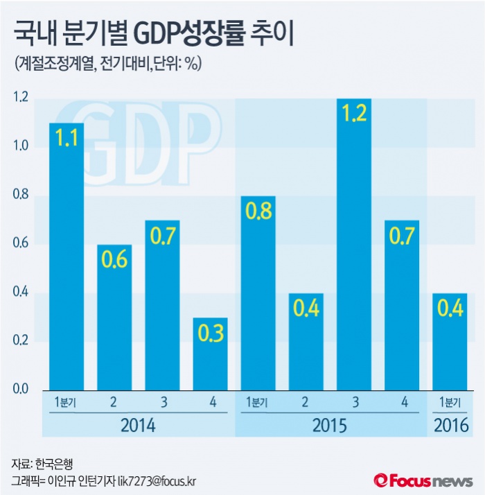 (서울=포커스뉴스) 올해 1분기 실질 국내총생산(GDP)이 전기보다 0.4% 성장하는데 그쳤다. 실질 GDP 성장률은 2분기 연속 0%대를 기록했다.