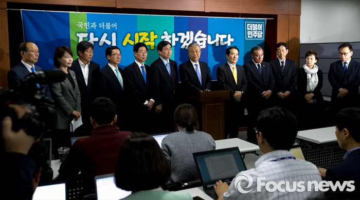 (광주=포커스뉴스) 김종인 더불어민주당 비대위 대표가 25일 오후 광주광역시의회 브리핑룸에서 광주 및 전남언론사 기자간담회를 하고 있다. 왼쪽부터 최운열 국민경제상황실장, 전현희 당선인, 이춘석, 정성호, 양승조 비대위원, 이종걸 원내대표, 김 대표, 정세균 의원, 이개호, 진영, 김현미 비대위원, 박광온 대변인.