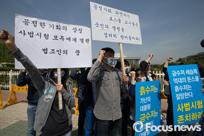 (서울=포커스뉴스) 26일 오전 서울 영등포구 국회의사당 앞에서 사법시험 준비 고시생들이 사법시범 존치를 촉구하고 있다.