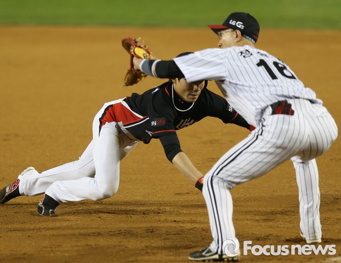 (서울=포커스뉴스) 29일 서울 잠실구장에서 열린 2016 프로야구 kt-LG 경기 7회초 1사 1루에서 kt 1루주자 심우준이 LG 투수 유원상의 견제구에 귀루하고 있다.