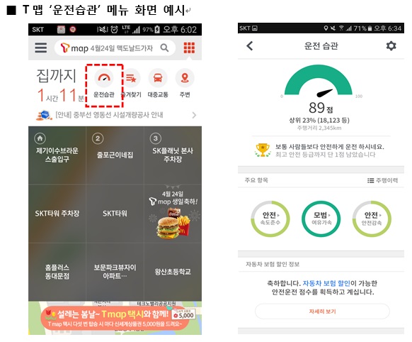 (서울=포커스뉴스) SK텔레콤이 ‘T맵(Tmap)’ 사용자들의 안전운전을 돕기 위해 신규 메뉴 ‘운전습관’을 추가한 ‘T맵 4.6버전’을 28일 출시했다. 또 동부화재는 T맵의 운전습관 주행 데이터를 기반으로 보험료를 할인해주는 내비게이션 연계 보험상품인 ‘스마T-UBI(Usage Based Insurance, 사용 기반의 보험) 안전운전 특약’을 이날 내놨다.