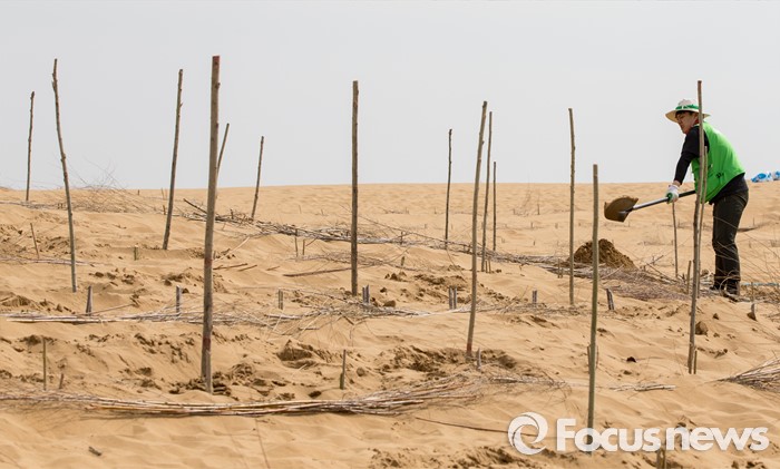 (다라더치/중국=포커스뉴스) 25일 오후 중국 내몽고 다라더치 쿠부치사막에서 2016 미래숲 15기 녹색봉사단원들이 나무 심기 작업을 하고 있다. 미래숲 녹색봉사단은 이번 봉사활동을 통해 황폐화된 사막에 나무 심기 및 각국 청년들과 우호를 증진을 위한 교류 활동을 전개했다.