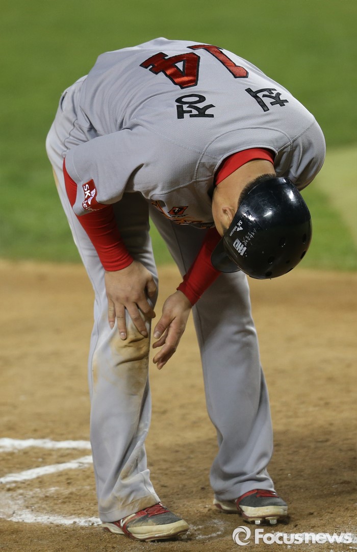 (서울=포커스뉴스) 27일 서울 잠실구장에서 열린 2016 프로야구 SK-두산 경기 6회초 2사 1루에서 SK 정의윤이 좌익수 왼쪽으로 빠지는 2루타때 1루주자 최정이 홈에서 슬라이딩하며 득점을 하고 무릎을 만지고 있다.