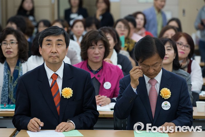 (서울=포커스뉴스) 27일 오후 서울 영등포구 이룸센터에서 열린 한국가정어린이집연합회 정기총회에 이종걸(왼쪽)더불어민주당 원내대표와 천정배 국민의당 공동대표가 참석하고 있다.