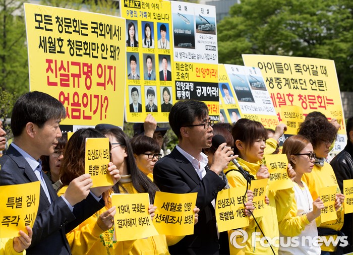 (서울=포커스뉴스) 25일 오전 서울 여의도 국회의사당 정문 앞에서 4월 16일의 약속국민연대 관계자들이 세월호 진상규명 특별법 개정 및 특검 실시 촉구 기자회견을 하고 있다.