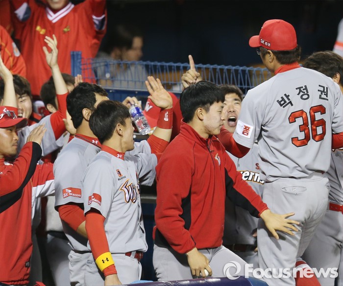 (서울=포커스뉴스) 28일 서울 잠실구장에서 열린 2016 프로야구 SK-두산 경기 6회말 1사 1,3루에서 두산 오재원의 타구를 잡아 병살로 연결한 SK 1루수 박정권이 덕아웃에서 동료들의 열렬한 환영을 받고 있다.