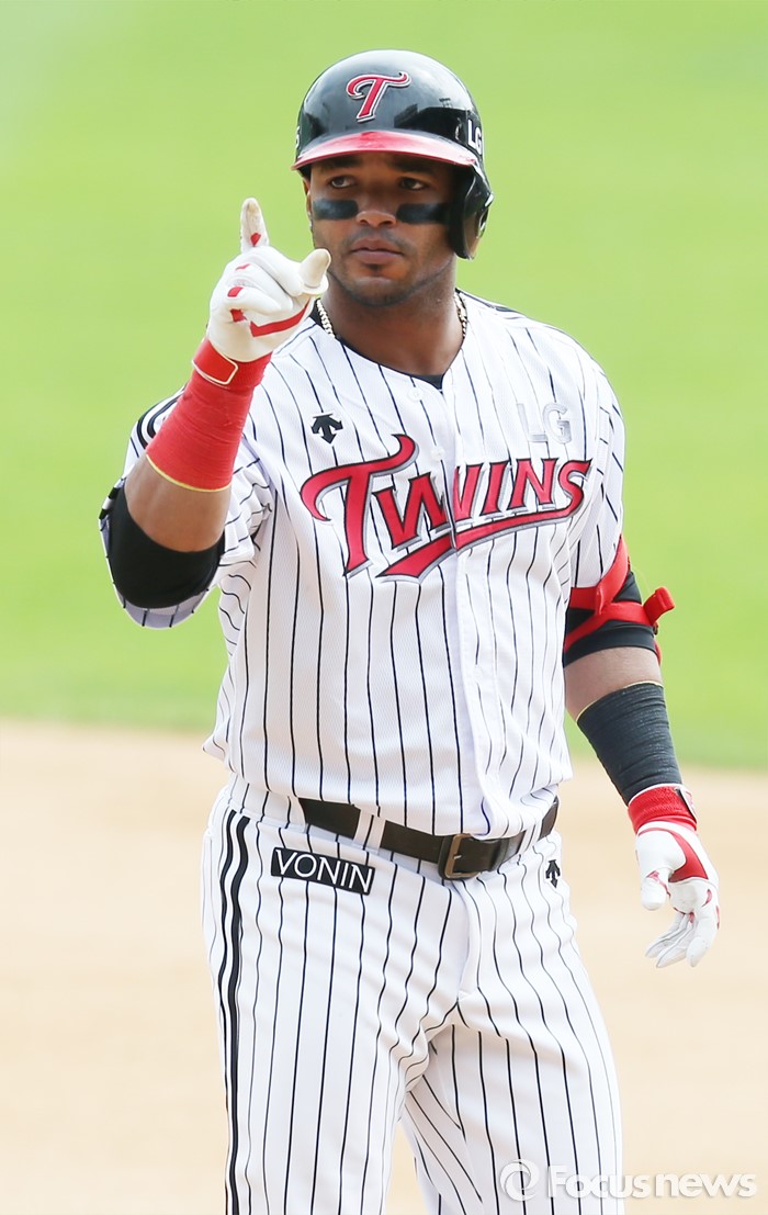 (서울=포커스뉴스) 1일 서울 잠실구장에서 열린 2016 프로야구 kt-LG 경기 3회말 1사 3루에서 LG 히메네스가 동점 주자를 불러 들이는 중전 안타를 치고 1루에서 세리머니를 하고 있다.
