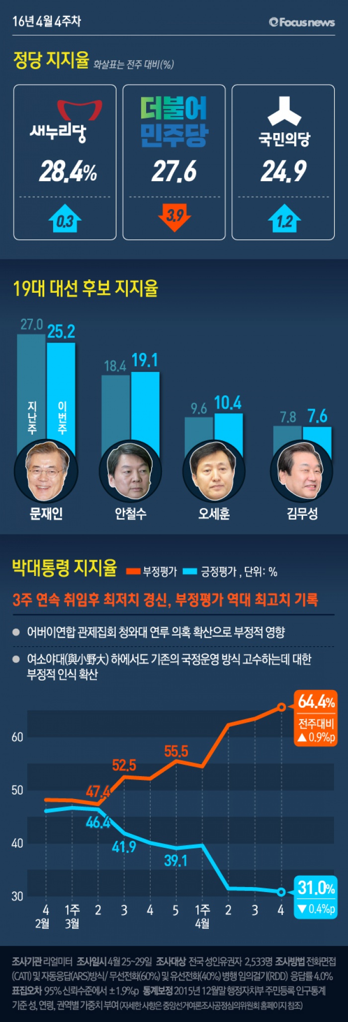 이번 2016년 4월 4주차 주간집계는 25일부터 29일까지 5일간 전국 19세 이상 유권자 2,533명을 대상으로 전화면접(CATI) 및 자동응답(ARS) 방식으로 무선전화(60%)와 유선전화(40%) 병행 임의걸기(RDD) 방법으로 조사했고, 응답률은 4.6%(총 통화 55,065명 중 2,533명 응답 완료)이다. 통계보정은 2015년 12월말 행정자치부 주민등록 인구통계 기준 성, 연령, 권역별 가중치 부여 방식으로 이루어졌고, 표본오차는 95% 신뢰수준에서 ±1.9%p이다. 일간집계는 ‘2일 이동 시계열(two-day rolling time-series)’ 방식으로 25일 1,016명, 26일 1,014명, 27일 1,013명, 28일 1,012명, 29일 1,011명을 대상으로 실시했고, 응답률은 25일 4.7%, 26일 4.8%, 27일 4.6%, 28일 4.5%, 29일 4.2%, 표집오차는 5일간 모두 95% 신뢰수준에서 ±3.1%p이다. 일간집계의 통계보정 방식은 주간집계와 동일하다.