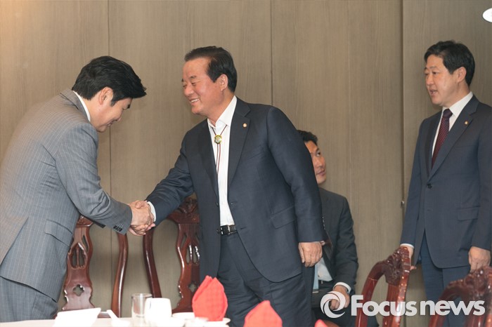 (서울=포커스뉴스) 원유철(왼쪽) 새누리당 원내대표와 정갑윤 국회부의장이 25일 오후 서울 여의도의 한 중식당에서 열린 중진의원 오찬 간담회에 참석해 악수하고 있다.