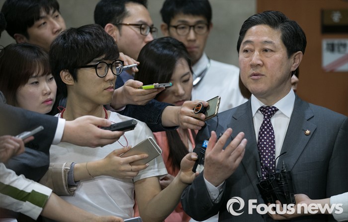 (서울=포커스뉴스) 유기준 새누리당 의원이 28일 오후 서울 여의도 국회 정론관에서 정책위의장 러닝메이트 후보인 이명수 의원과 원내대표 출마 기자회견을 마친 뒤 취재진 질문에 답하고 있다.