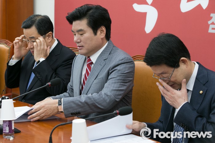 (서울=포커스뉴스) 김정훈(왼쪽부터) 새누리당 정책위의장과 원유철 원내대표, 정희수 기재위원장이 25일 오전 서울 여의도 국회에서 열린 상임위원장 · 간사단 연석회의에 참석해, 생각에 잠겨 있다.