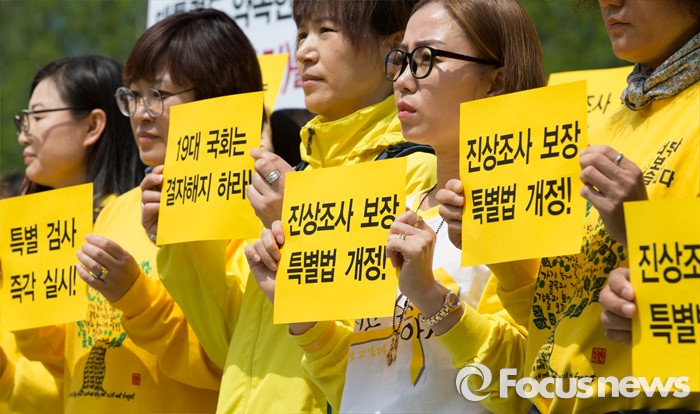 (서울=포커스뉴스) 25일 오전 서울 여의도 국회의사당 정문 앞에서 4월 16일의 약속국민연대 관계자들이 세월호 진상규명 특별법 개정 및 특검 실시 촉구 기자회견을 하고 있다.