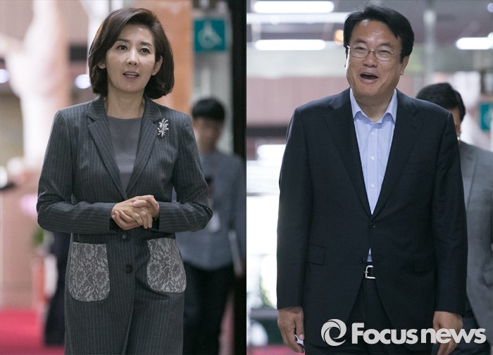 (서울=포커스뉴스) 새누리당 차기 원내대표 후보로 거론되는 나경원 의원(왼쪽)과 정진석 당선인이 29일 오전 서울 여의도 국회에서 각각 원유철 원내대표와 면담을 위해 이동하고 있다.